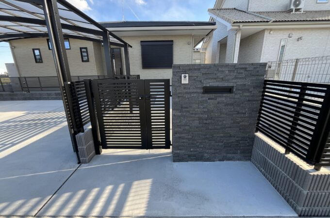 渋川市 門柱、駐車場コンクリート、カーポート、植栽、ウッドデッキ、境界ブロック